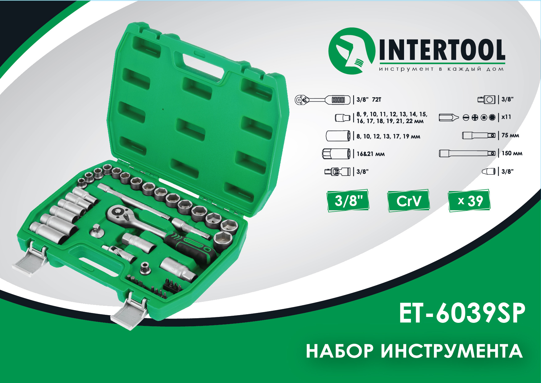Автомобильный набор инструментов для авто гаража мотоцикла в кейсе головки биты 3/8" 8-22 мм 39 ед (ET-6039SP) INTERTOOL ET-9039