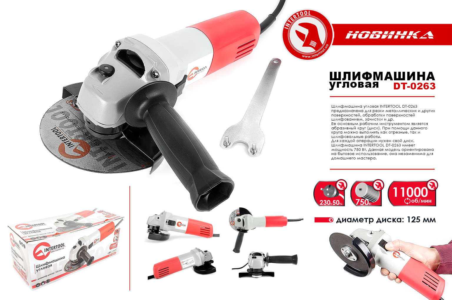 Шлифмашина угловая 750 Вт, 11000 об/мин, диаметр круга 125 мм INTERTOOL DT-0263
