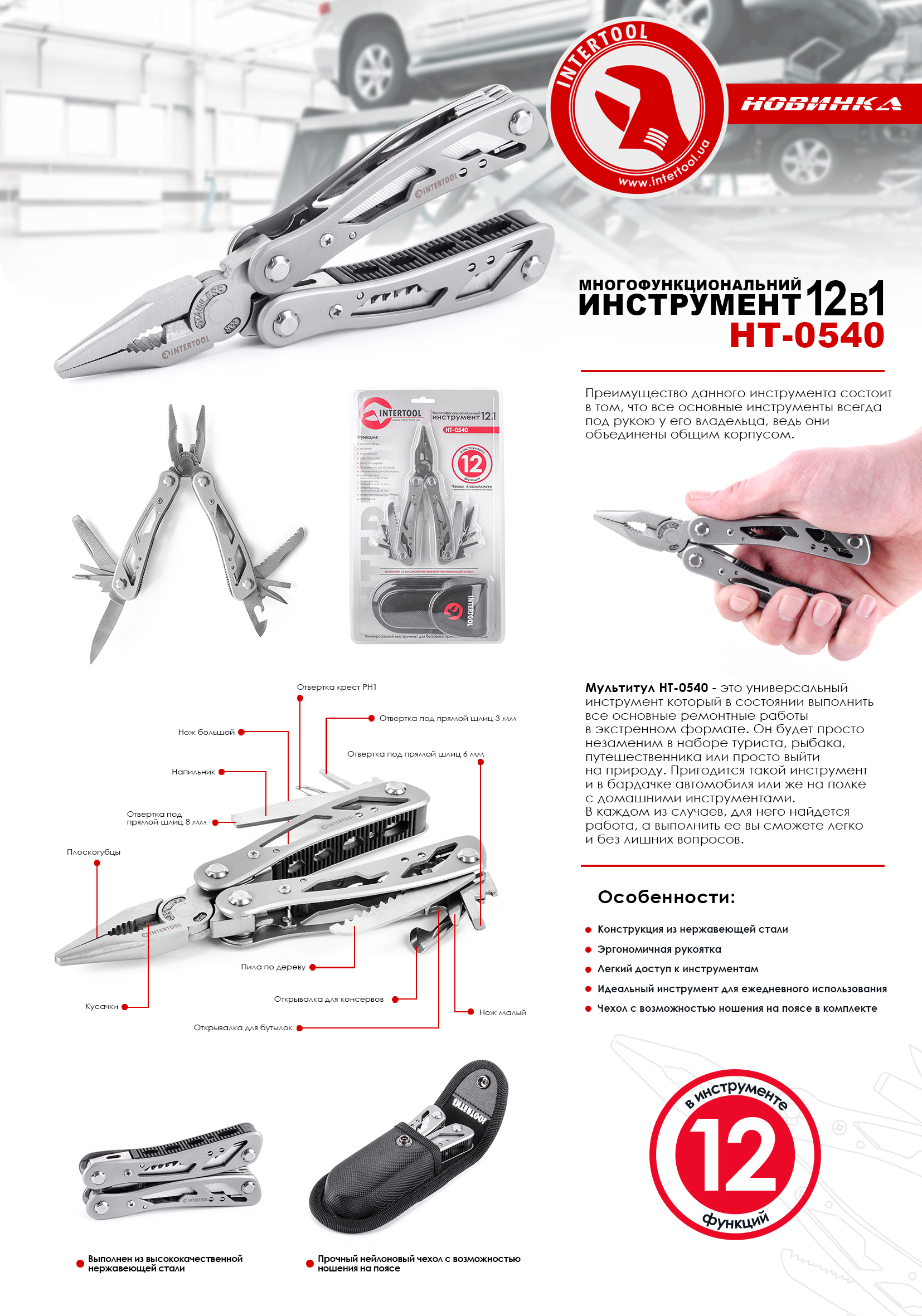 Мультиинструмент 165 мм, 12 в 1 с чехлом INTERTOOL HT-0540